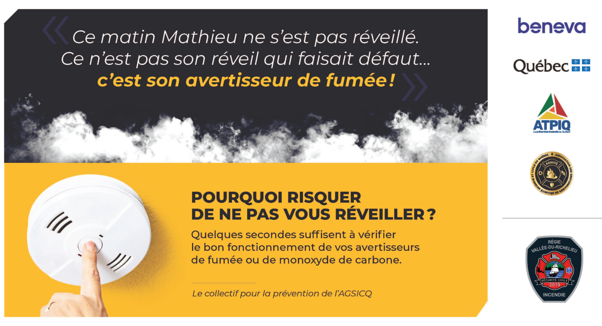 C’est dans ce contexte que le Collectif pour la prévention de l’AGSICQ, auquel participe la Régie de sécurité incendie de la Vallée-du-Richelieu, lance une campagne de sensibilisation percutante en cette Semaine de la prévention des incendies. L’objectif est clair : rappeler à tous l’importance d’avoir des avertisseurs de fumée et de monoxyde de carbone en bon état de fonctionnement.